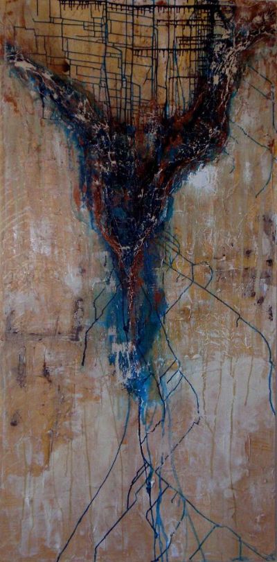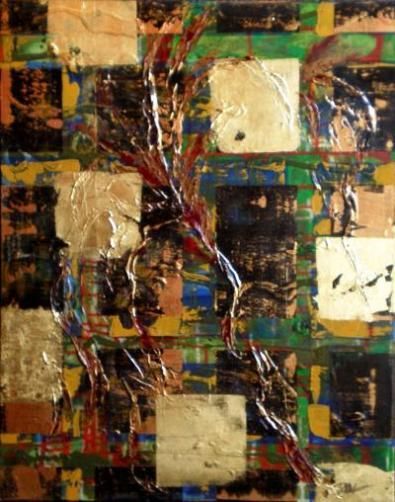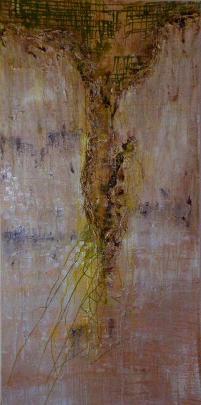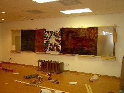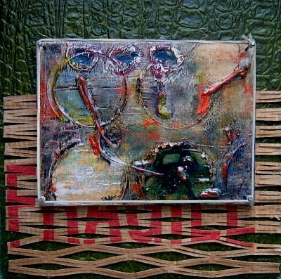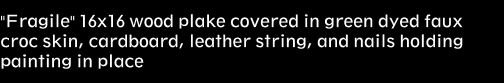This is the construction of the piece which is made out of wood, sheet metal, acrylic, plastic, chain link, feathers, stones, dirt, batteries, moss, copper wire and moulding