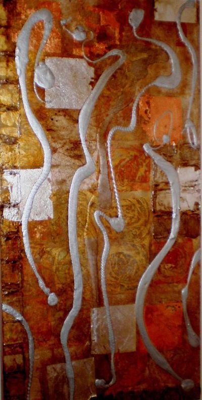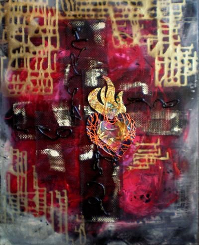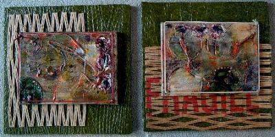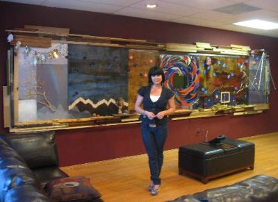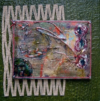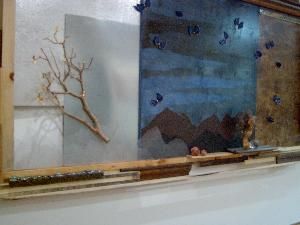 This is the nature side in progress where I created a mountain range out of leather and toothpicks and butterflies assembled from hand dyed paper and metal studs