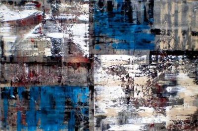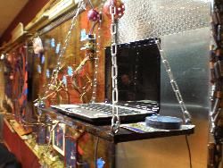 The laptop powers the flatscreen in the center of the piece to display moving images